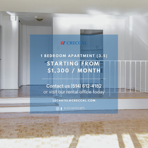 ***PROMOTIONS AVAILABLE*** With views overlooking the beautiful skyline of downtown Montreal, Le Chatel will make you find the tranquility that fits perfectly with the thrill of an urban lifestyle. In the heart of the creative city of Montreal, Le Chatel is an established apartment building where our residents can enjoy the proximity of restaurants, stores, universities and much more.The establishment is also located at just a few seconds from the metro station Guy Concordia and several bus lines making your everyday transportation easier. Le Chatel has 24/7 doorman services with fob card and intercom systems making your safety our priority.A full-sized indoor swimming pool and an in-house laundry facility is conveniently located in the building. Our one-bedroom apartments come equipped with plenty of living and storage space. All utilities and amenities included in the rent except for cable, telephone, internet, and parking.--------------------------------------------------------***PROMOTIONS EN COURS***Tout au centre de la brillante ville de Montréal, Le Chatel est une résidence d'appartements ou nos habitants peuvent profiter de la proximité; des restaurants, magasins, universités et bien plus encore. Le Chatel est situé à quelques secondes de la station de métro Guy Concordia ainsi que plusieurs lignes de bus facilitant vos déplacements de tous les jours.Avec un système de cartes d'accès et d'intercom, Le Chatel garde comme priorité; la sécurité; de ses résidents avec des mesures mises en place 24h/24 et 7j/7. A l'intérieur de l'immeuble se trouve une piscine intérieur chauffée ainsi qu'une buanderie.